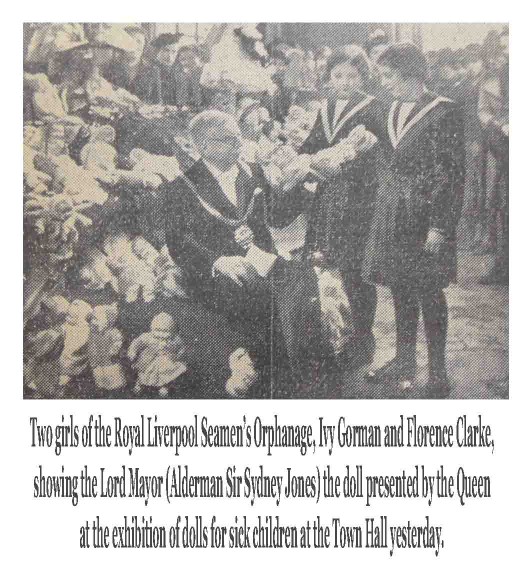 The exhibition was held in the Council Chamber, and the Lord Mayor (Alderman Sir Sydney Jones), in thanking the workers, said the dolls would bear a message of hope and good cheer to those who received them. Twelve year old Ivy Gorman, a scholar from the Royal Liverpool Seamen's Orphanage, made an excellent little speech in thanking the Lord Mayor for his interest in the children, and the workers for their great kindness in dressing the dolls.