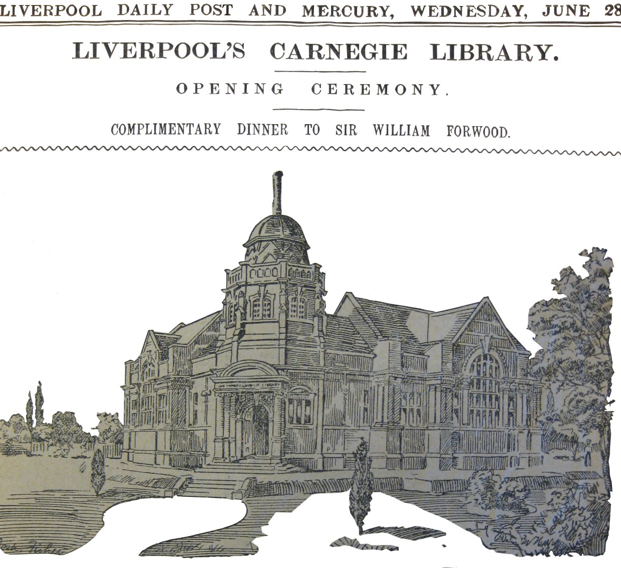 The Branch Library which has been erected on the corner of Green Lane, West Derby and Lister Drive, through the municifence of Mr. Andrew Carnegie at the cost of £15.750, was last evening formally opened by Sir. William B. Forwood, chairman of the Library, Museum, and Arts committee. The New Library whuch has been stocked with 8.500 volumes in all departments of Literature, is a handsome structure, built from designs prepared under the direction of Mr. Thomas Shelmerdine, Corporation Surveyor.