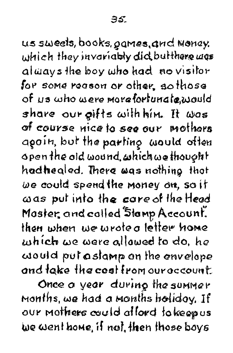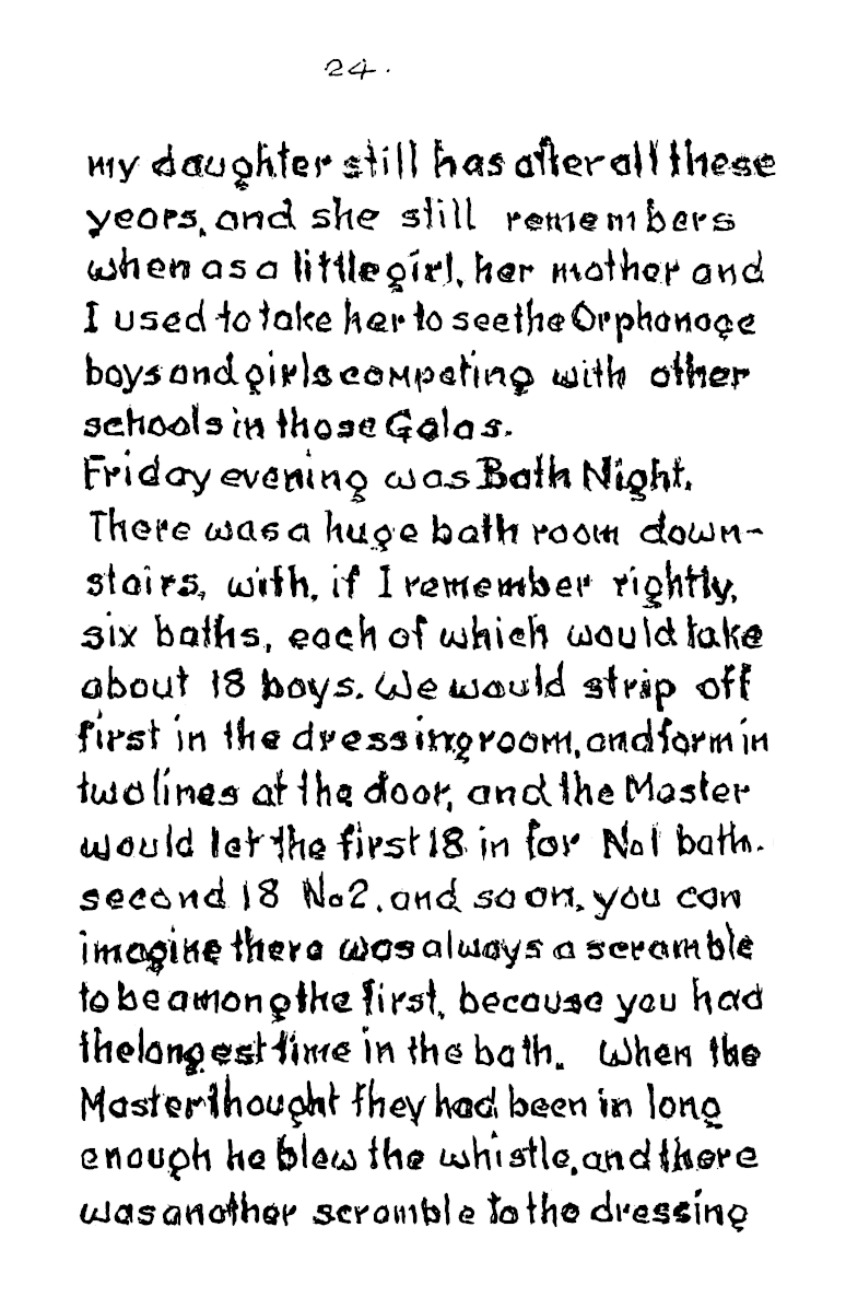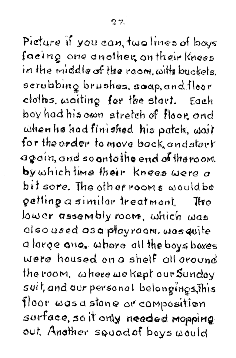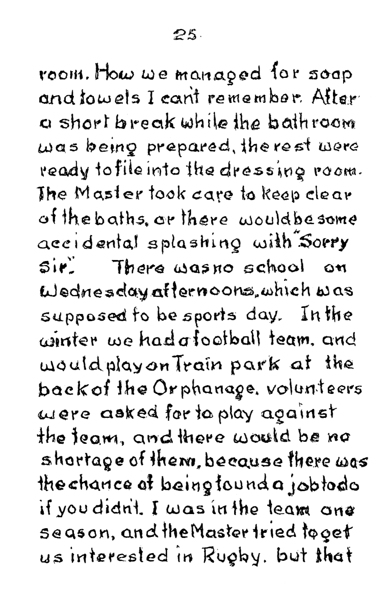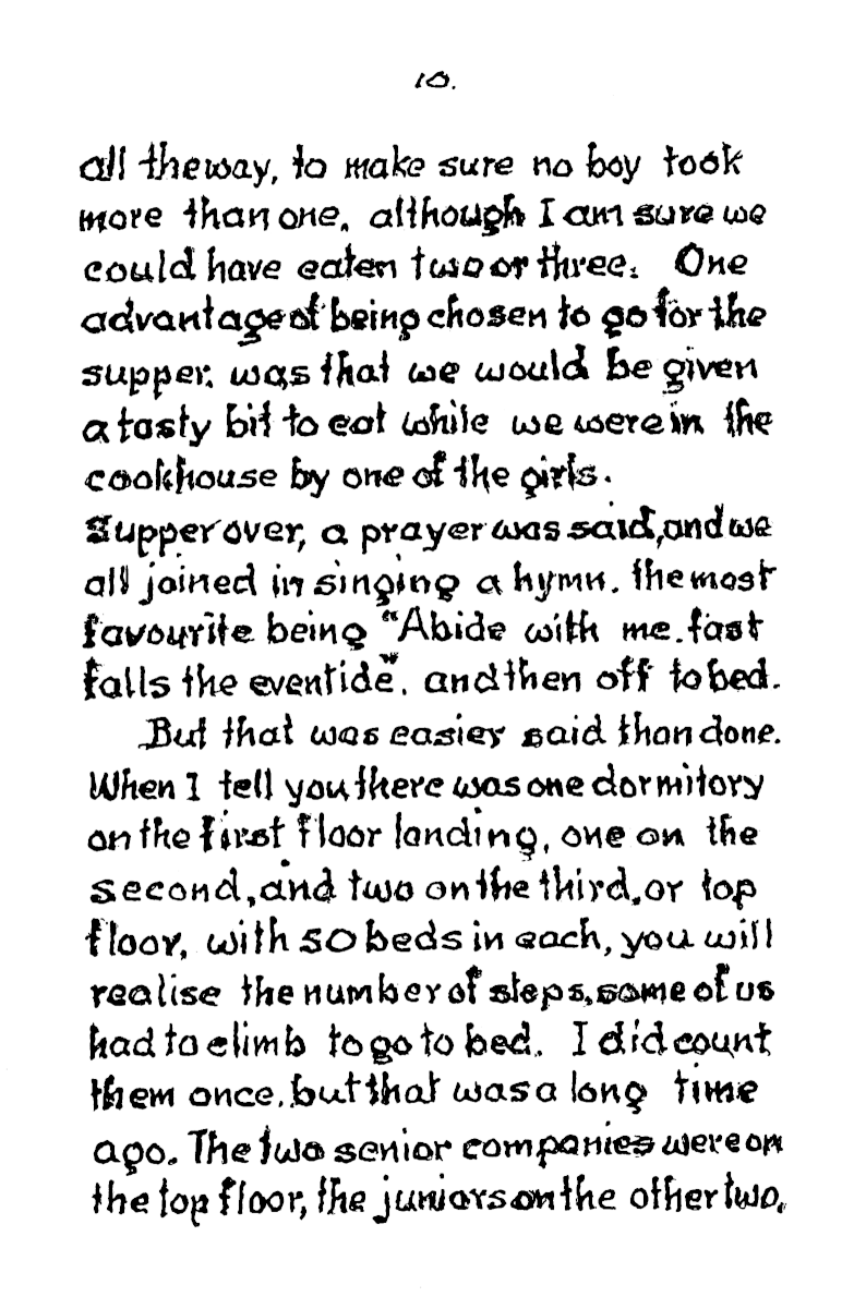 Each dormitory held 50, and even the baths where built to accommodate eighteen at a time. At the start of mealtime a whistle blew to signify grace and a second whistle signified “start eating”. There was no choice of cereal packets at breakfast. Anyone who left their porridge would find it still on the table at lunchtime, and it had to be got down. When Frank’s younger brother first started, he couldn’t stand porridge, so frank would slip in secretly during the mornings and eat it for him, giving his brother his own piece of bread in exchange.