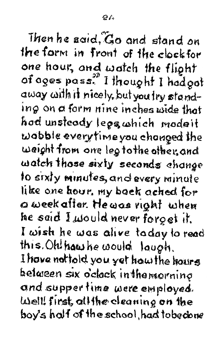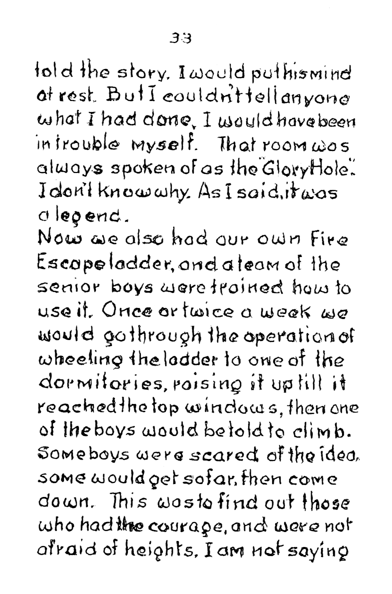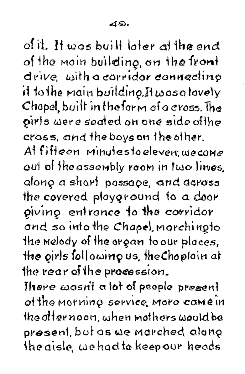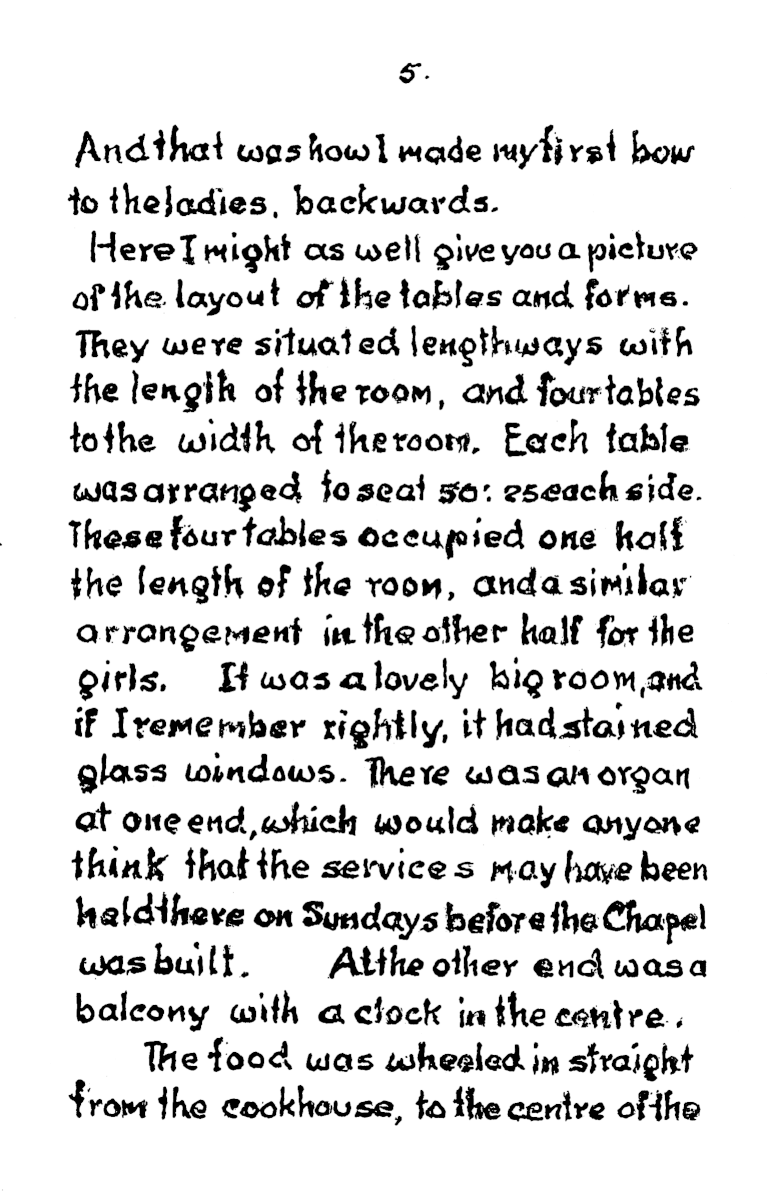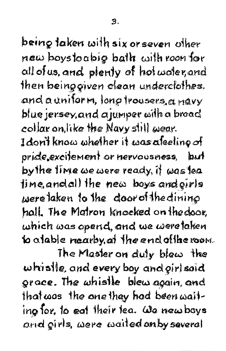 Each dormitory held 50, and even the baths where built to accommodate eighteen at a time. At the start of mealtime a whistle blew to signify grace and a second whistle signified “start eating”. There was no choice of cereal packets at breakfast. Anyone who left their porridge would find it still on the table at lunchtime, and it had to be got down. When Frank’s younger brother first started, he couldn’t stand porridge, so frank would slip in secretly during the mornings and eat it for him, giving his brother his own piece of bread in exchange.
